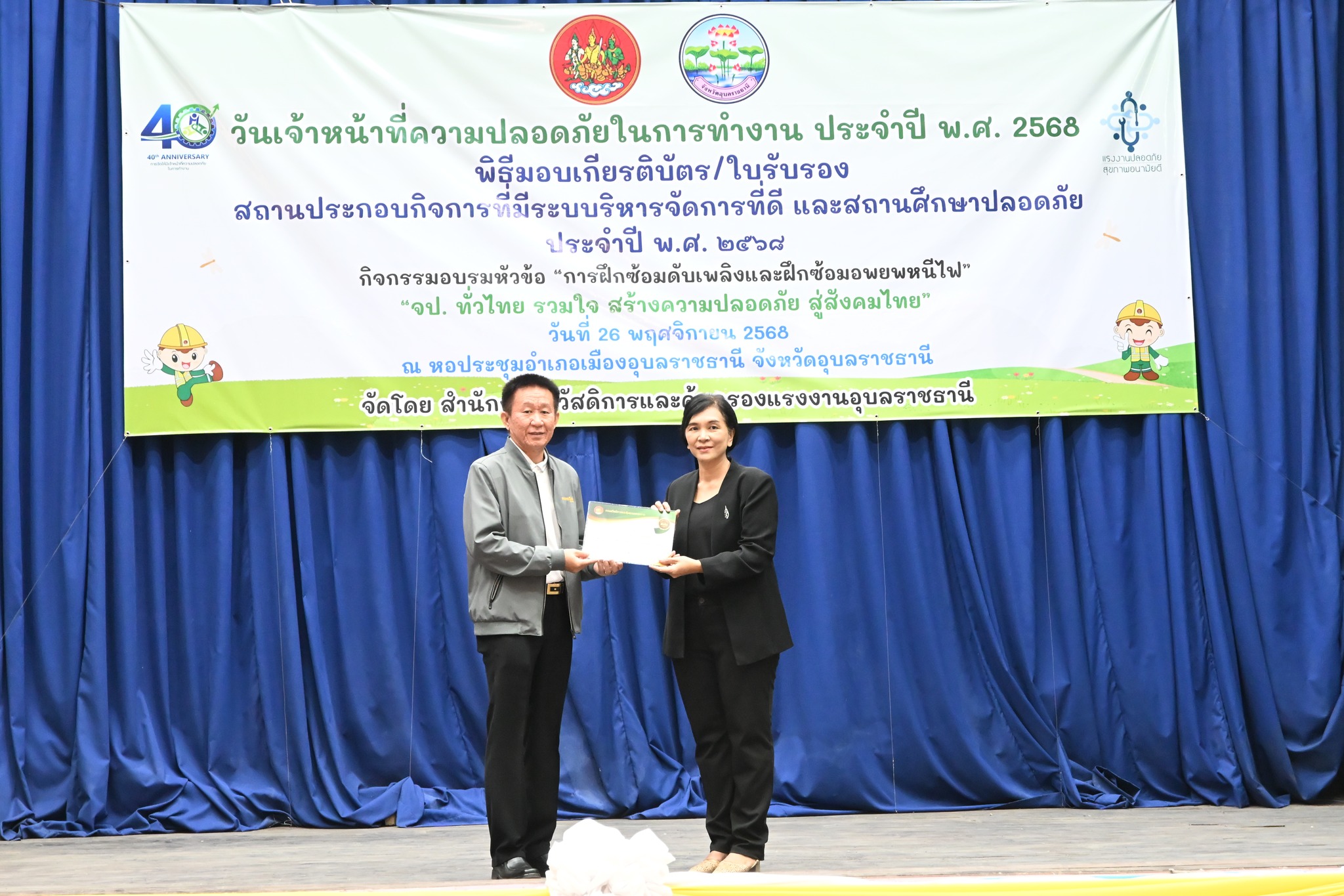 รับเกียรติบัตรสถานศึกษาปลอดภัย ประจำปี พ.ศ. 2568 ณ หอประชุมอำเภอเมืองอุบลราชธานี จังหวัดอุบลราชธานี