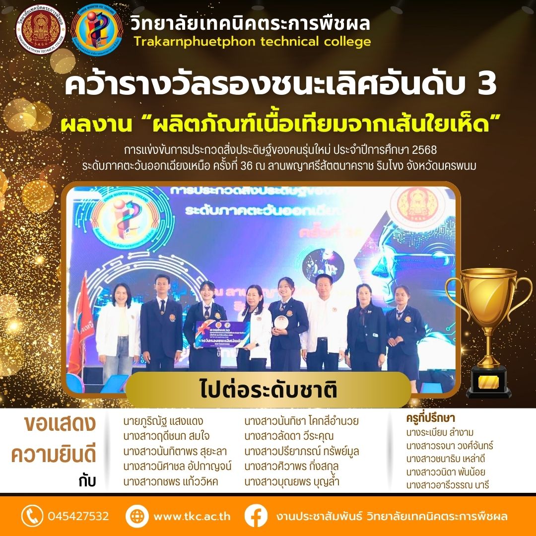 วิทยาลัยเทคนิคตระการพืชผล คว้า 2 รางวัล การแข่งขันการประกวดสิ่งประดิษฐ์ของคนรุ่นใหม่ ประจำปีการศึกษา 2568 ระดับภาคตะวันออกเฉียงเหนือ ครั้งที่ 36