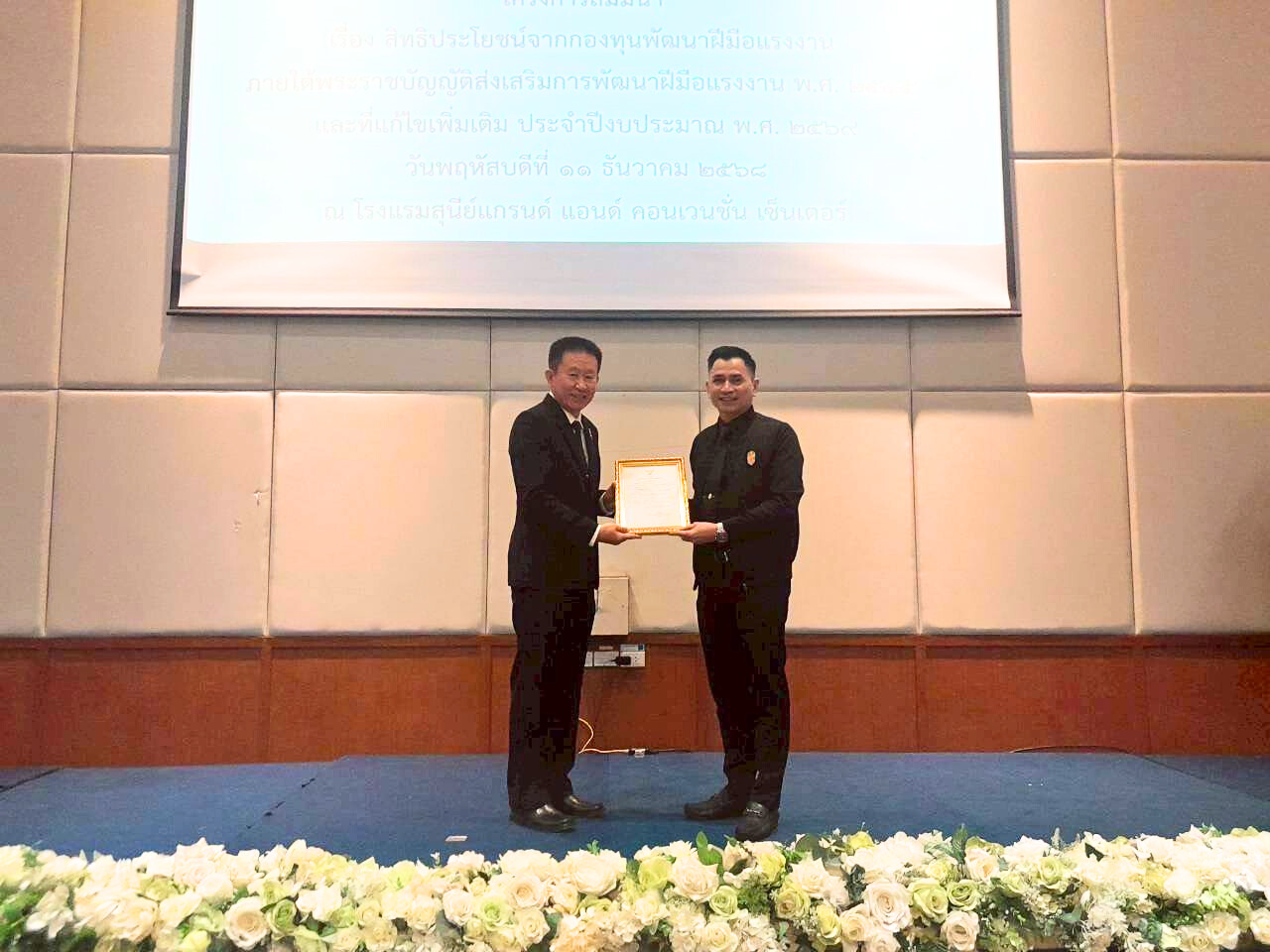 ร่วมพิธีมอบใบอนุญาตเป็นผู้ดำเนินการทดสอบมาตรฐานฝีมือแรงงาน ในวาระก่อนพิธีเปิด โครงการสัมมนา เรื่องสิทธิประโยชน์จากกองทุนพัฒนาฝีมือแรงงาน ภายใต้พระราชบัญญัติส่งเสริมการพัฒนาฝีมือแรงงาน พ.ศ. 2545