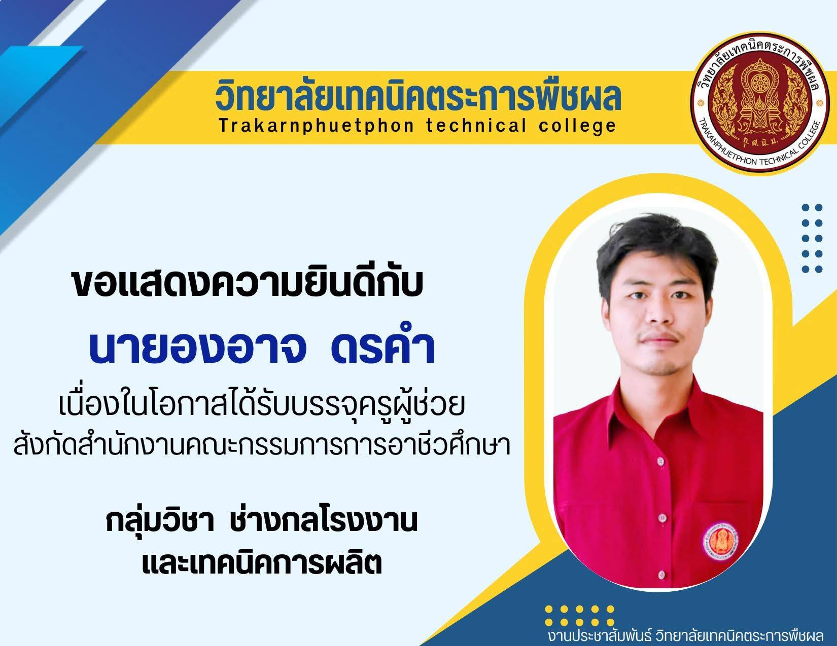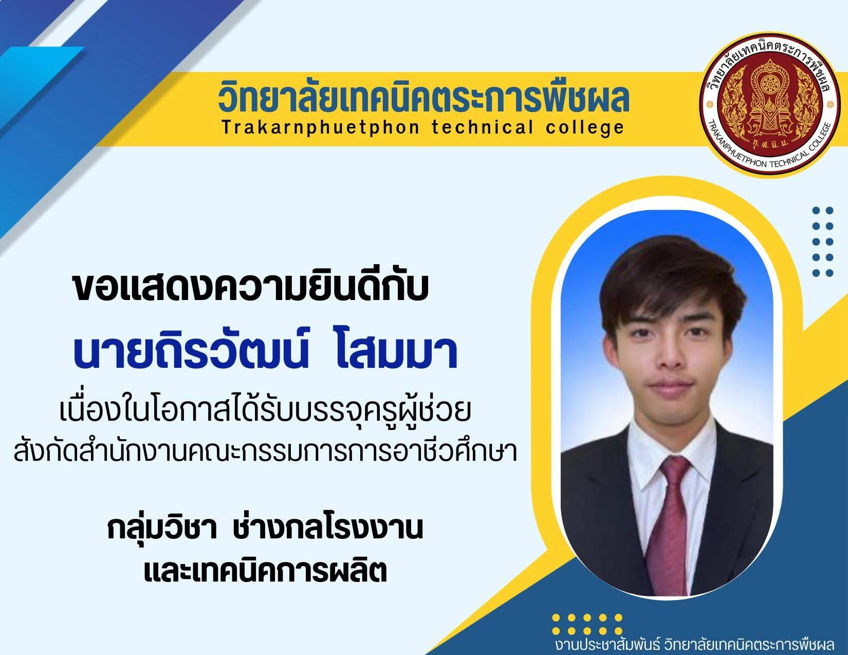 คณะผู้บริหาร ครู และบุคลากรทางการศึกษา วิทยาลัยเทคนิคตระการพืชผล ขอแสดงความยินดี กับครูทั้ง 3 ท่าน ที่ได้รับการคัดเลือกสอบบรรจุ ตำแหน่ง ครูผู้ช่วย สังกัดสำนักงานคณะกรรมการการอาชีวศึกษา (สอศ.)