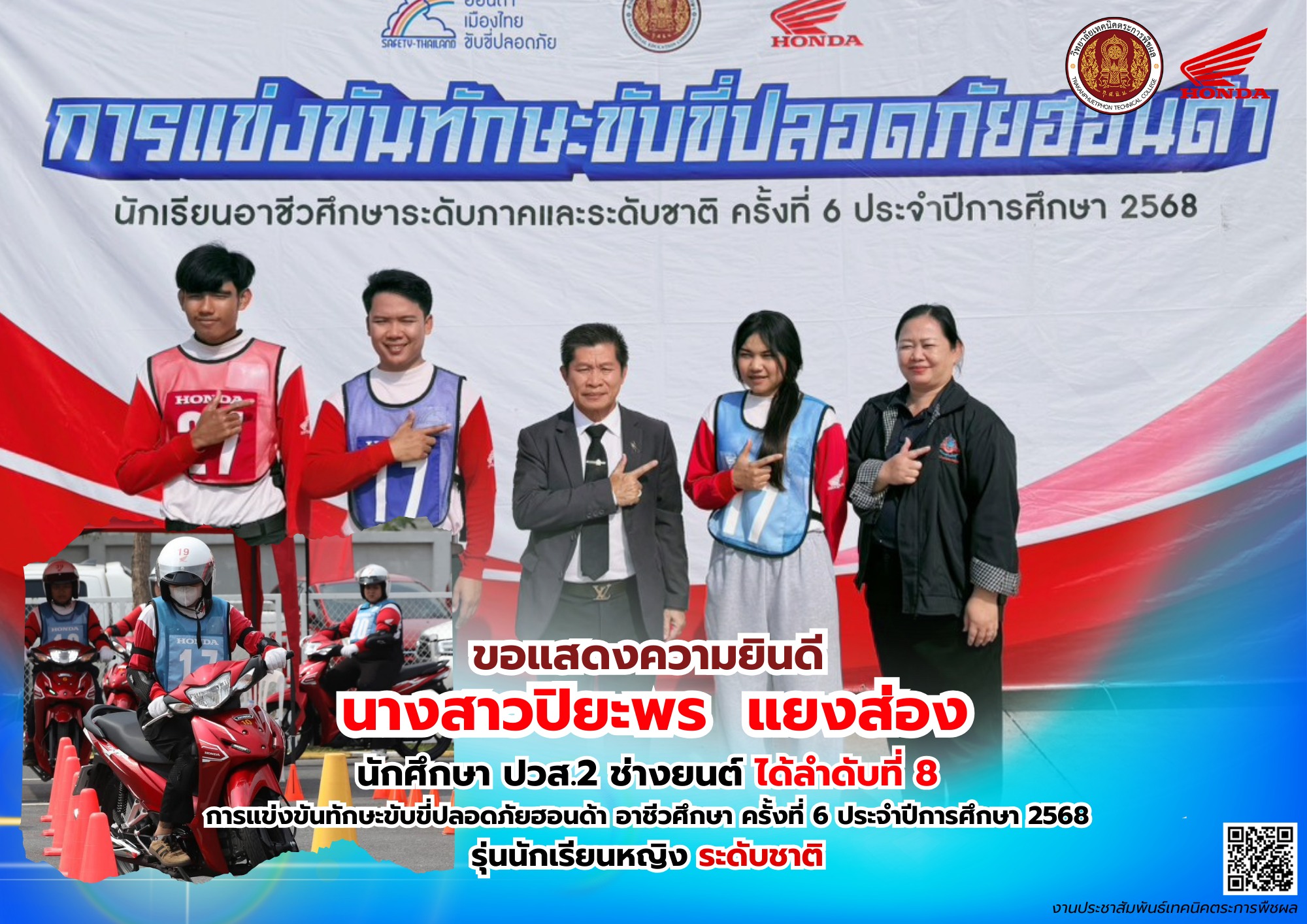 นางสาวปิยะพร แยงส่อง นักศึกษา ปวส.2 ช่างยนต์ ได้ลำดับที่ 8 รุ่นนักเรียนหญิง และนายทรงพล อุดมพันธ์ นักศึกษา ปวส.1 ช่างยนต์ ได้ลำดับที่ 12 การแข่งขันทักษะขับขี่ปลอดภัยฮอนด้า อาชีวศึกษา ครั้งที่ 6 ประจำปีการศึกษา 2568 รุ่นนักเรียนชาย ระดับชาติ![]()