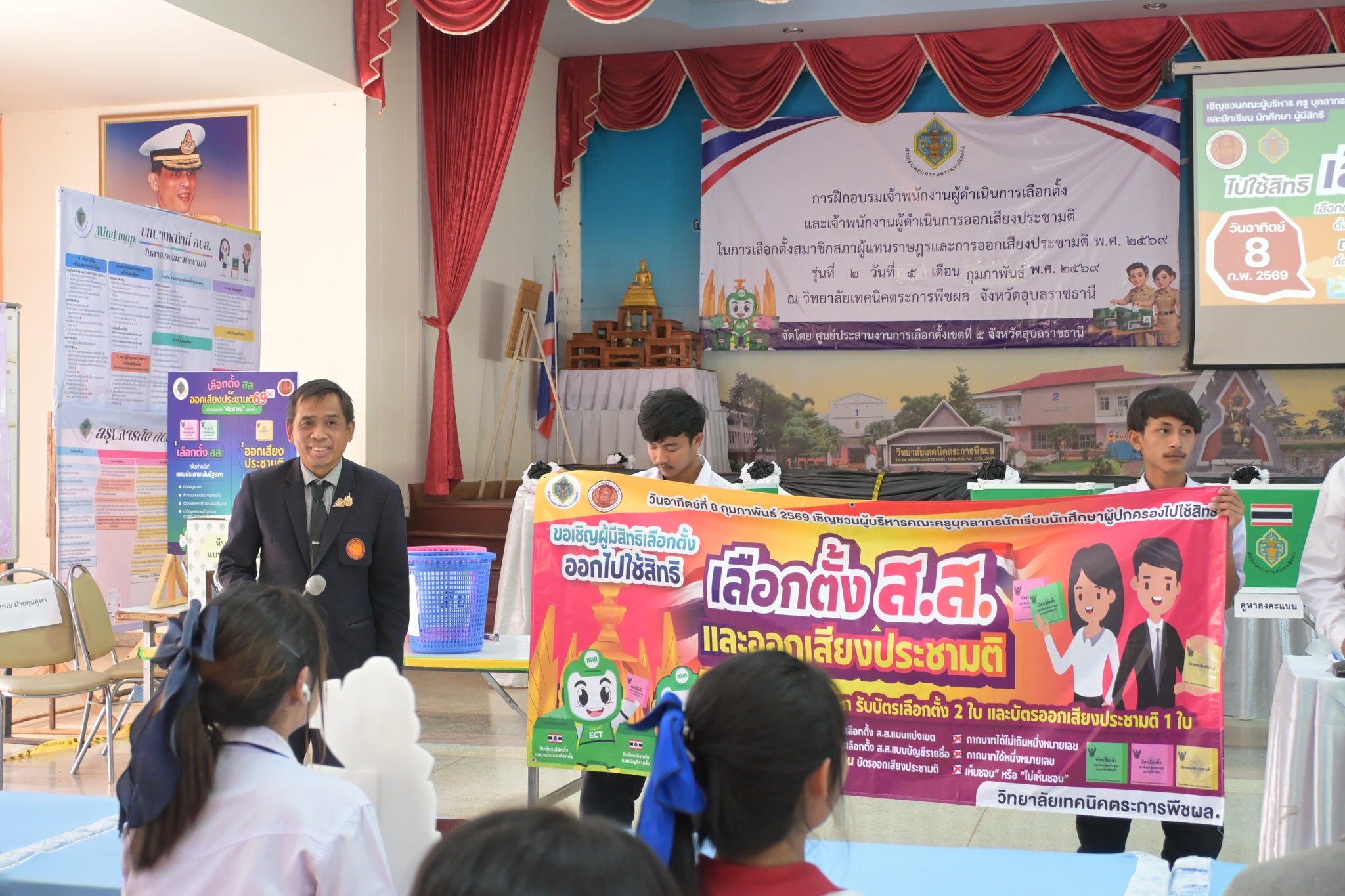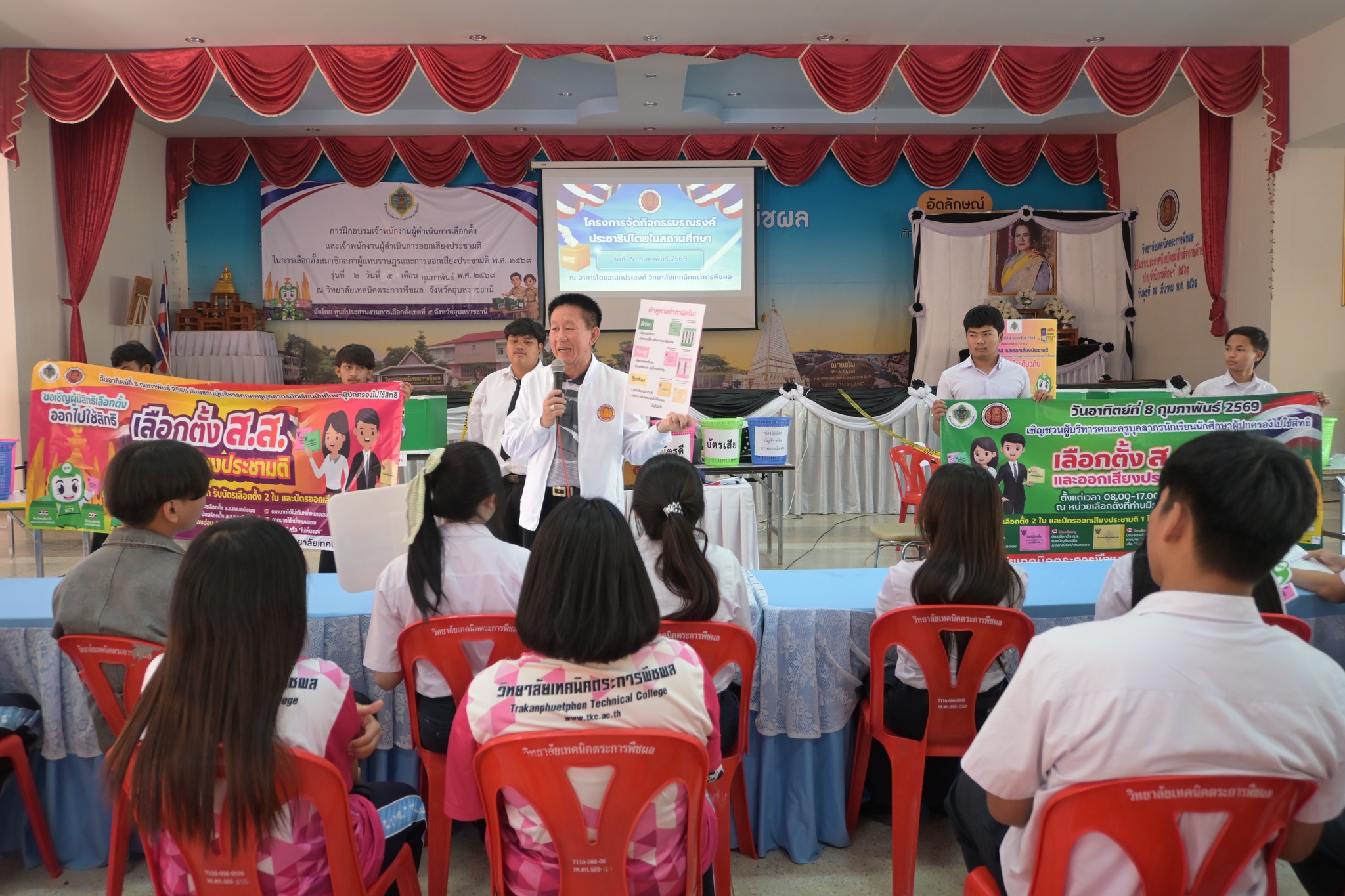 วันพฤหัสบดีที่ 5 กุมภาพันธ์ 2569 วิทยาลัยเทคนิคตระการพืชผล โดย นายมนตรี สุริยพันตรี ผู้อำนวยการวิทยาลัยเทคนิคตระการพืชผล พร้อมด้วยนายกรวิทย์ สระประไพ รองผู้อำนวยการฝ่ายพัฒนากิจการนักเรียน นักศึกษา คณะครู และนักเรียน นักศึกษา เข้าร่วมโครงการกิจกรรมรณรงค์ประชาธิปไตยในสถานศึกษา ประจำปีการศึกษา 2568 ณ หอประชุมโนนแม่เมาะ อาคารอำนวยการ วิทยาลัยเทคนิคตระการพืชผล
